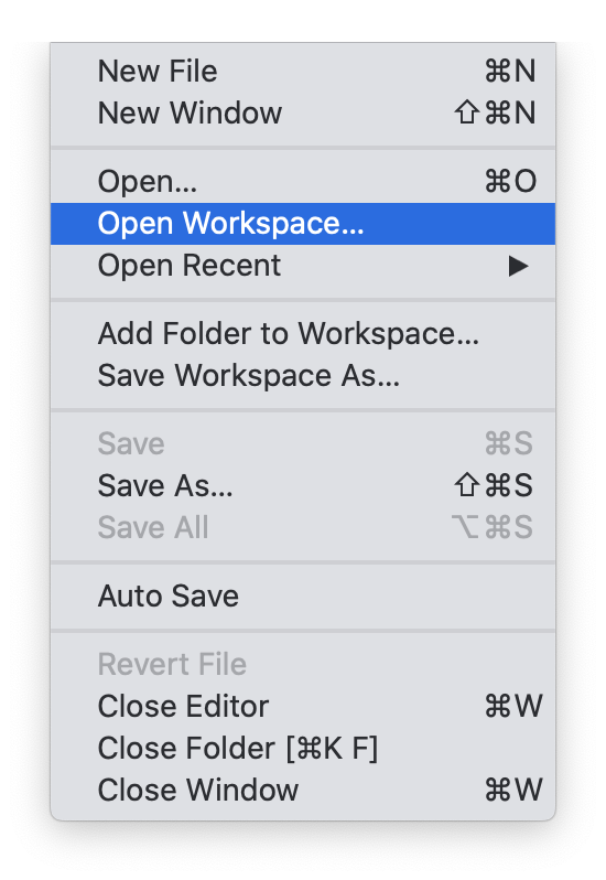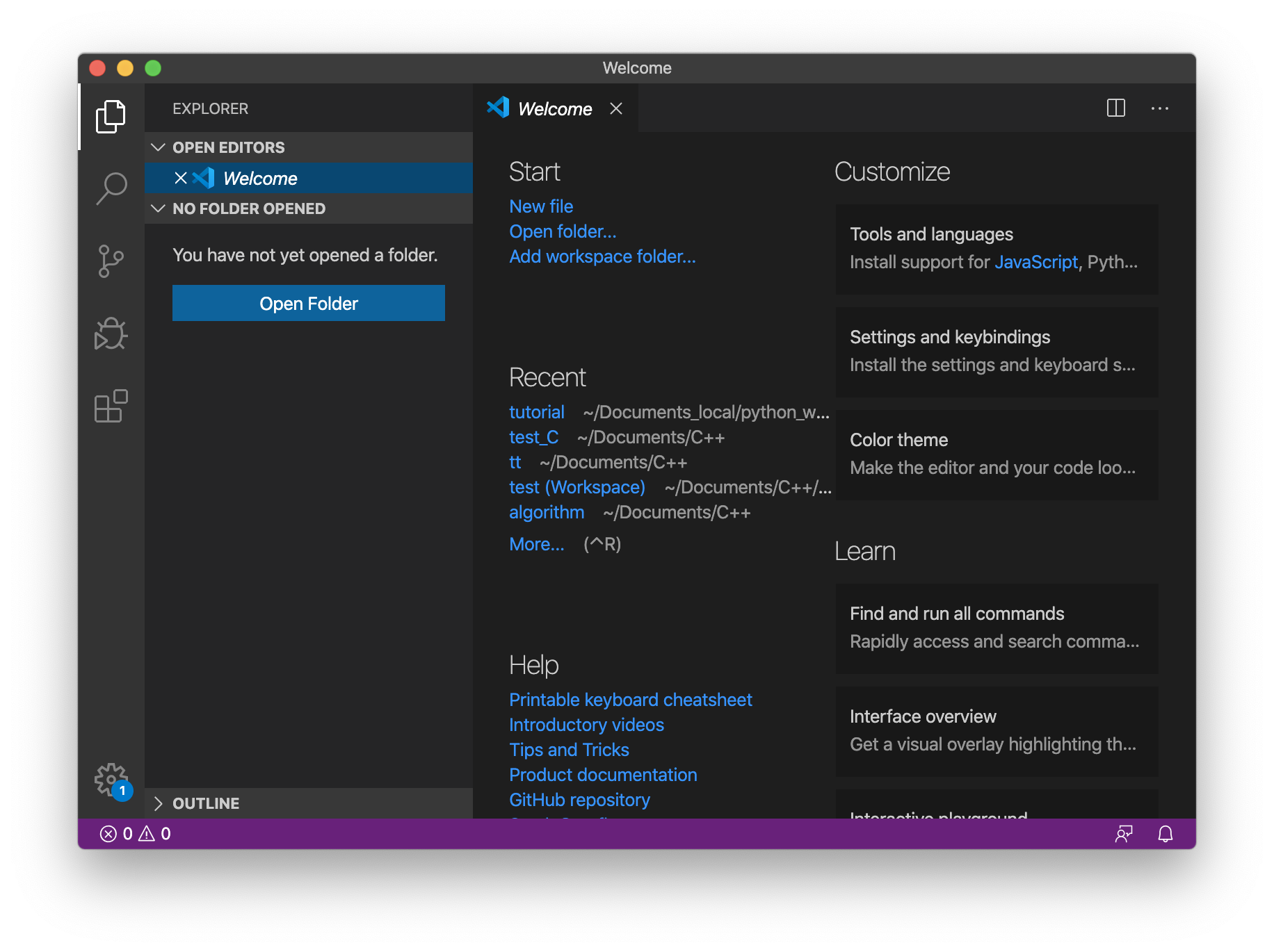 설치가 완료되면 좌측 첫번째 아이콘을 누르시고 Explorer에서 파란색 open folder 버튼을 누르거나, 메뉴에서 File - Open Workspace를 눌러서 작업공간이 될 폴더를 선택합니다.
