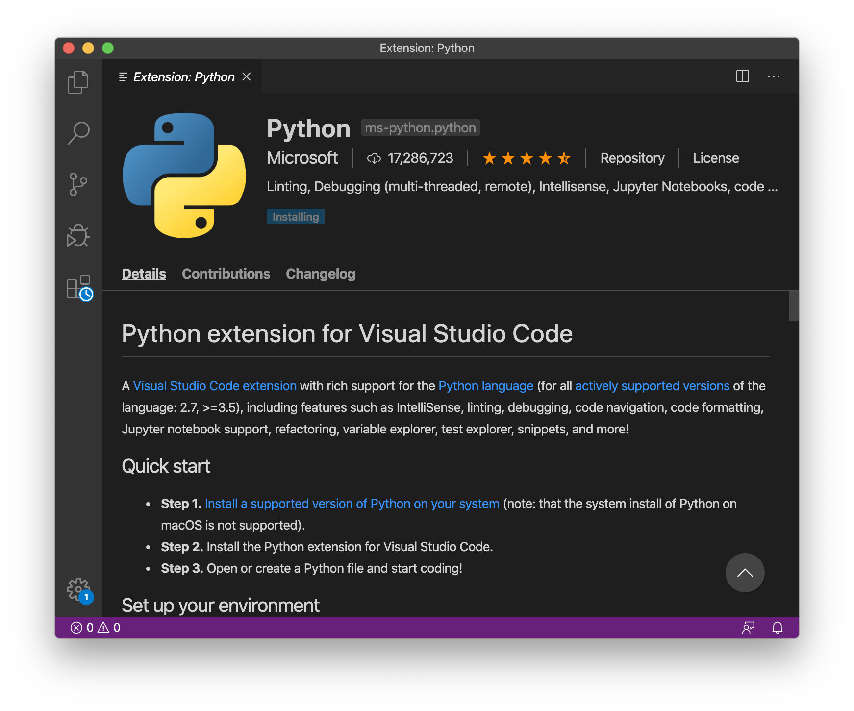 설치가 끝나면 좌측 가장 하단의 Extension 버튼을 누르고 상단의 검색창에 python을 검색해주세요.