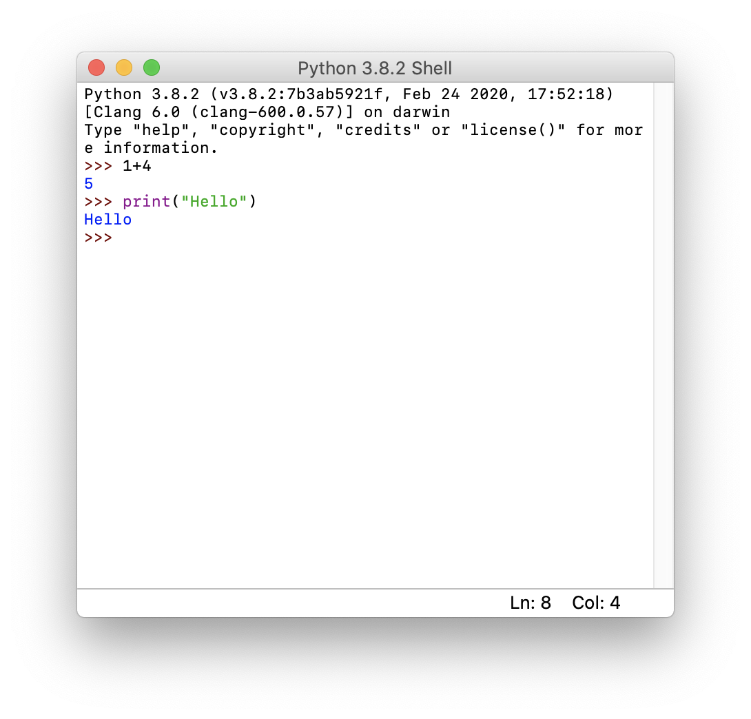 설치가 완료되면 폴더에 다음과 같은 파일들이 있습니다. 그 중에 IDLE는 파이썬을 위한 통합개발환경으로 클릭해서 열어보시면 다음과 같은 shell창이 뜹니다. 파이썬은 한줄씩 입력할 때 마다 실행되는 인터프리터 언어입니다. 예를들어 1+4 이라고 작성하고 엔터를 누르면 바로 5라는 답을 주는 것을 확인할 수 있습니다.