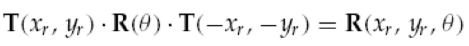 앞서 언급한 변환들을 합성하면 여러가지 변환을 표현하는 행렬을 만들어낼 수 있습니다. 예를들어 특정 정점을 기준으로 하는 회전은 다음과 같은 기본 변환을 거치면 됩니다.