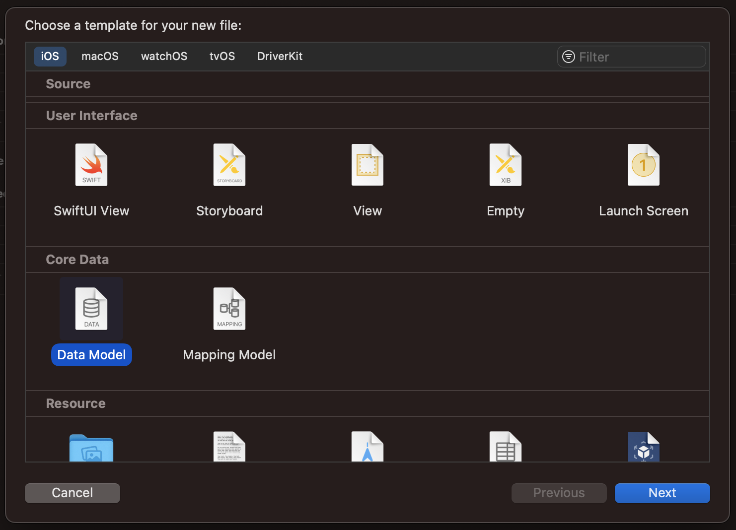 만약 처음에 프로젝트를 만들 때 CoreData를 사용한다고 체크하지 않았다면 그냥 파일을 하나 만들어주면 됩니다. Model.xcdatamodeld 파일을 하나 만들어보겠습니다.