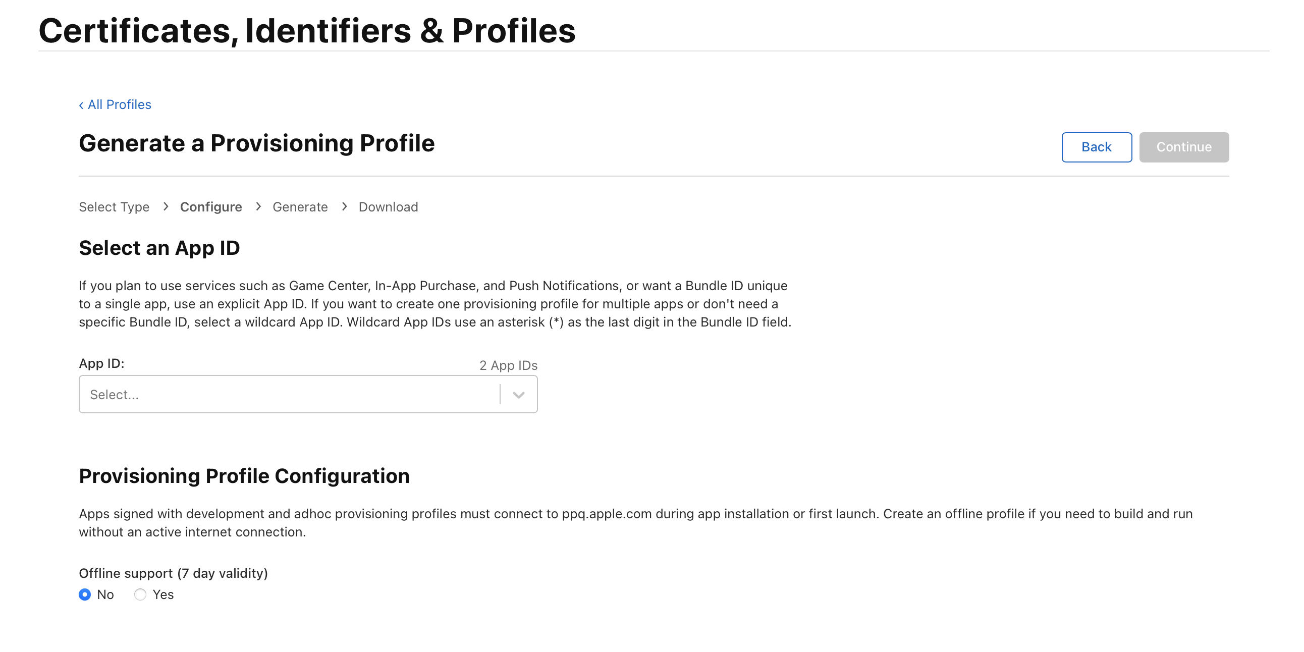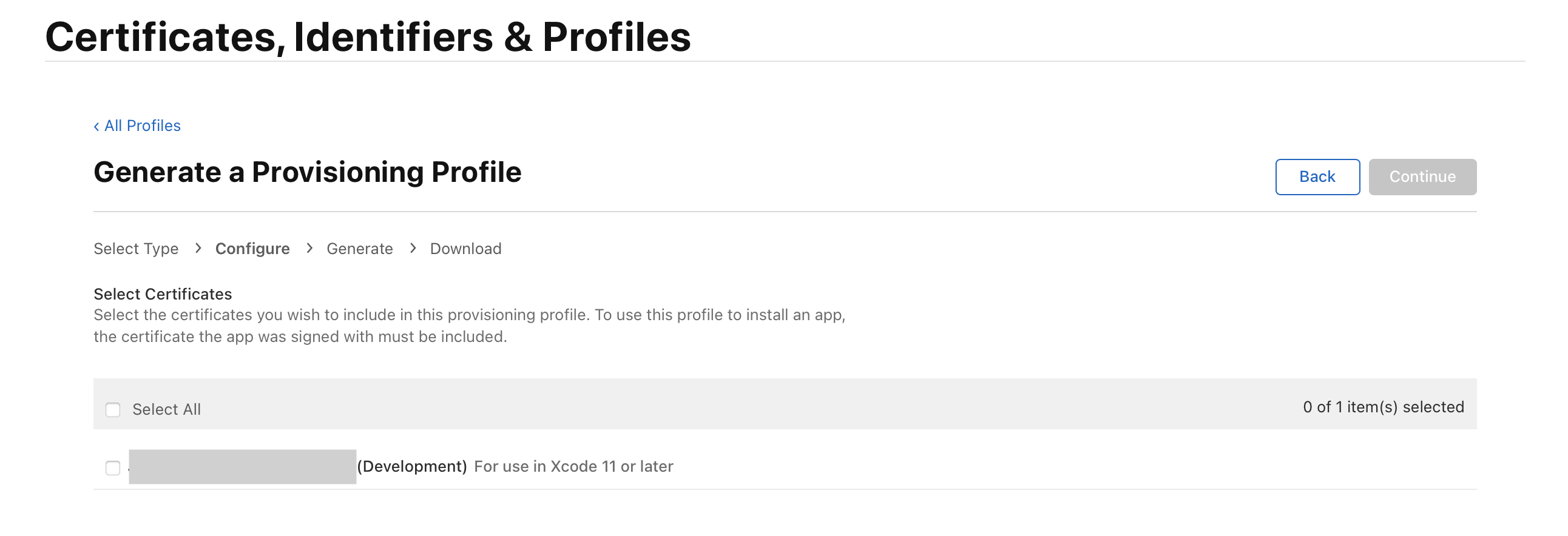 - 개발자 페이지에서 Provisioning Profile 생성하기 (Profile) - AppID에 개발자 인증서, 등록된 기기 목록을 매핑하기