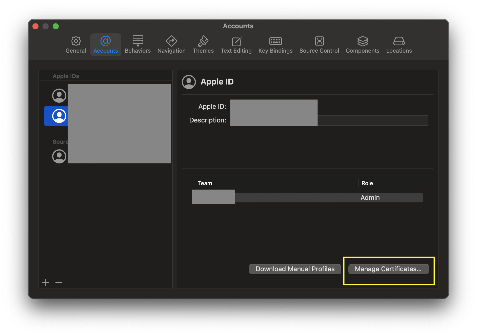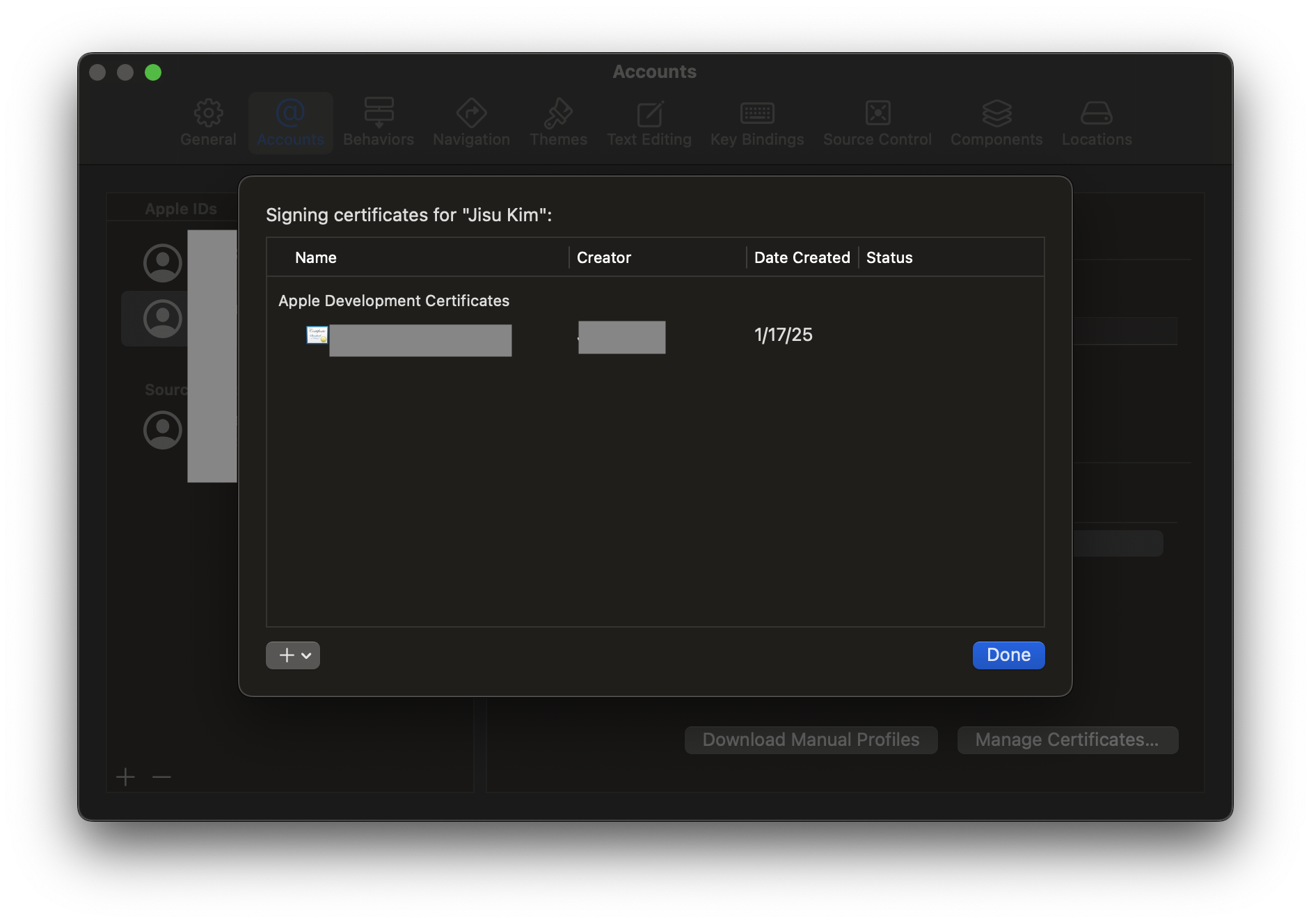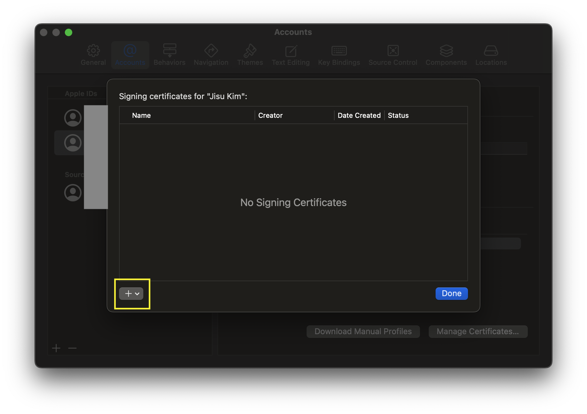 Xcode > Settings > Accounts에 사용자를 AppleID를 추가하고