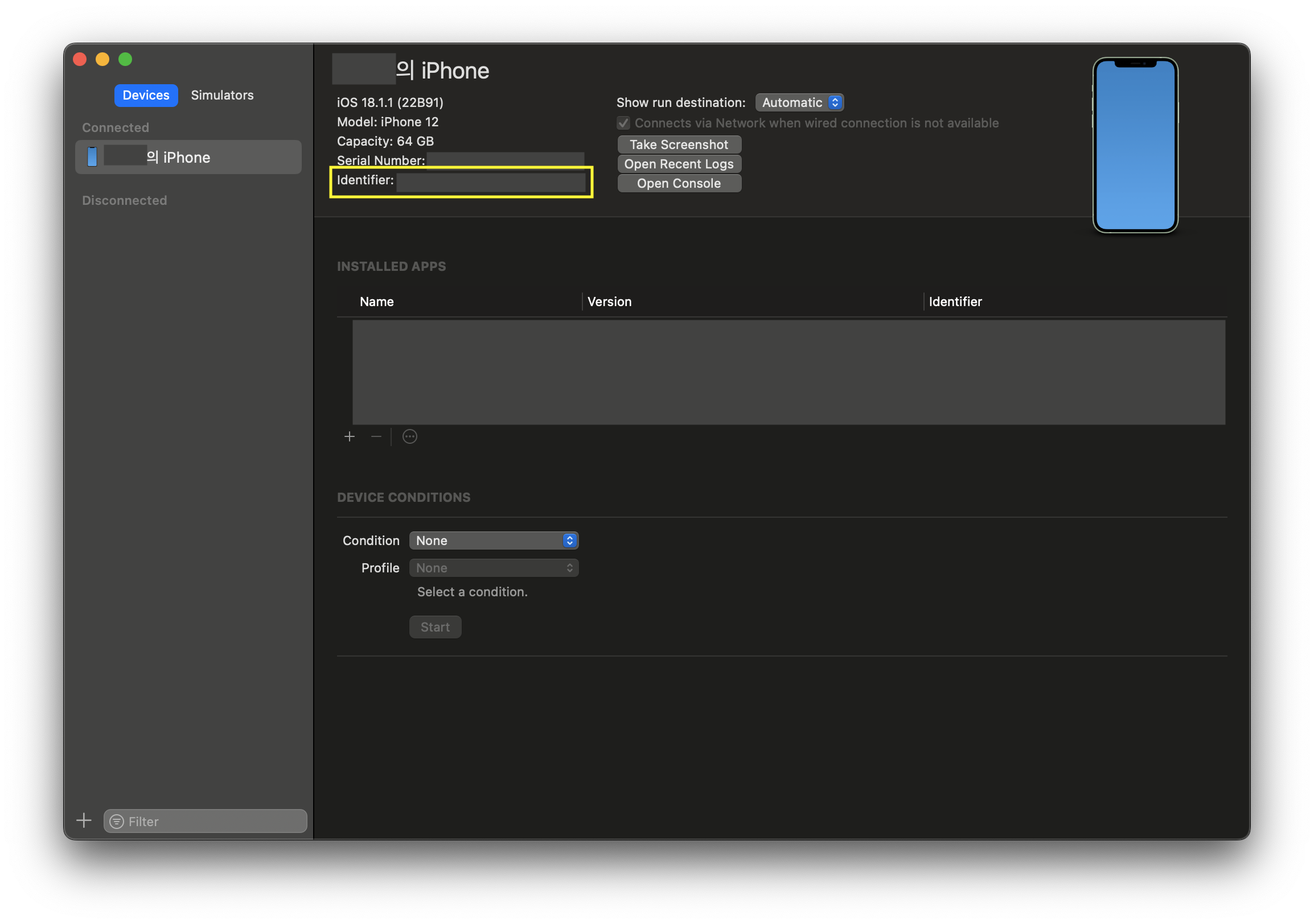 등록하려는 아이폰을 케이블로 맥에 연결하고 Xcode > Windows > Devices and Simulators를 선택해주세요