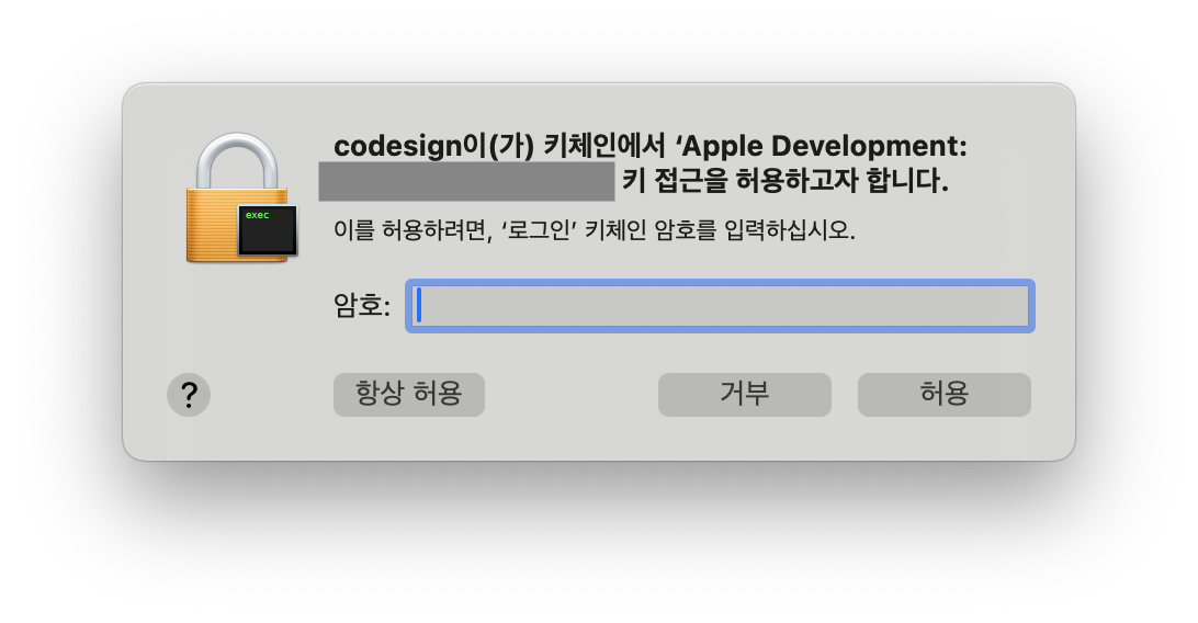 codesign이(가) 키체인에서 'Apple Development:' 키 접근을 허용하고자 합니다.