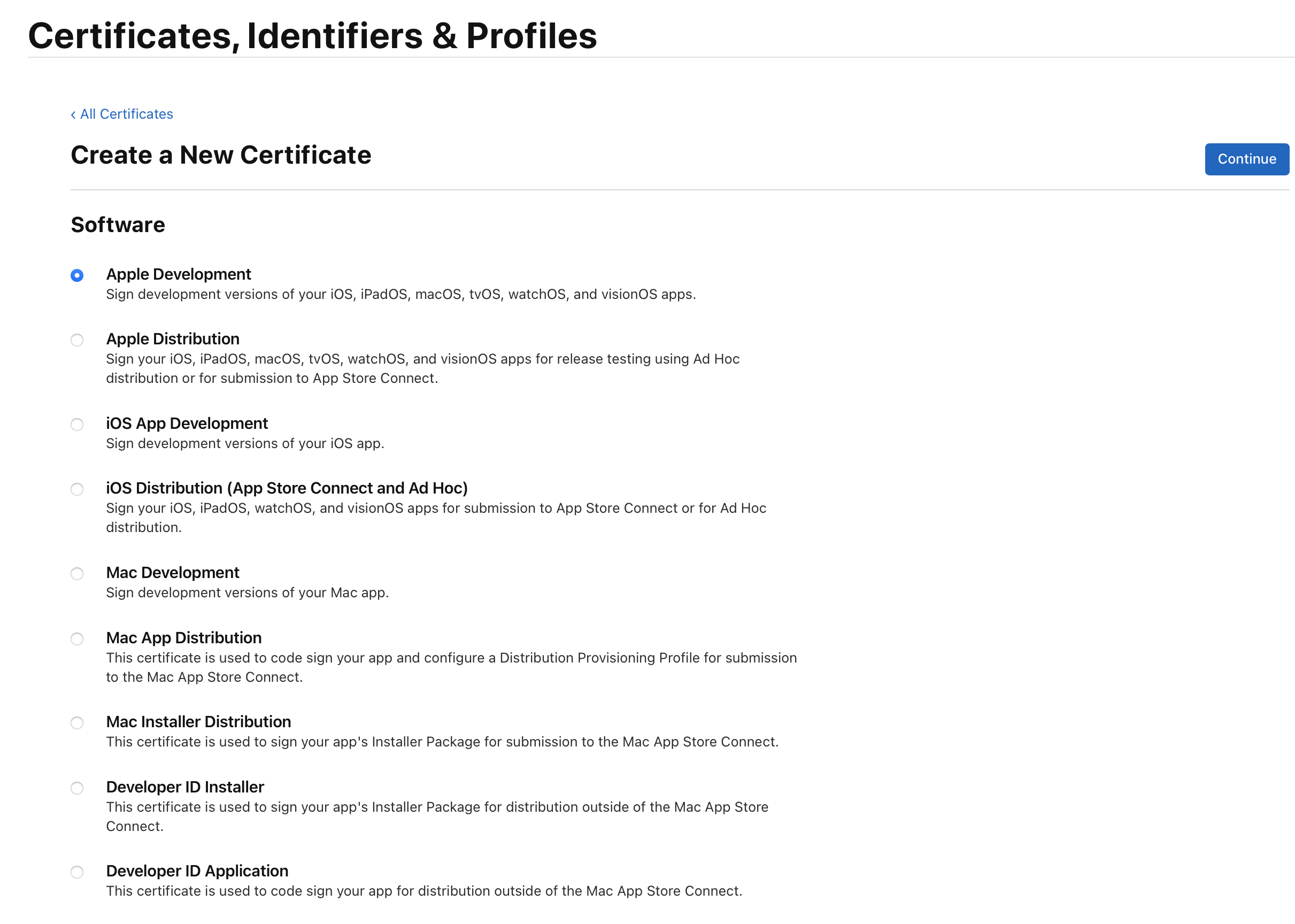 첫번째 Apple Developement를 선택하고 다음으로 넘어가봅시다.