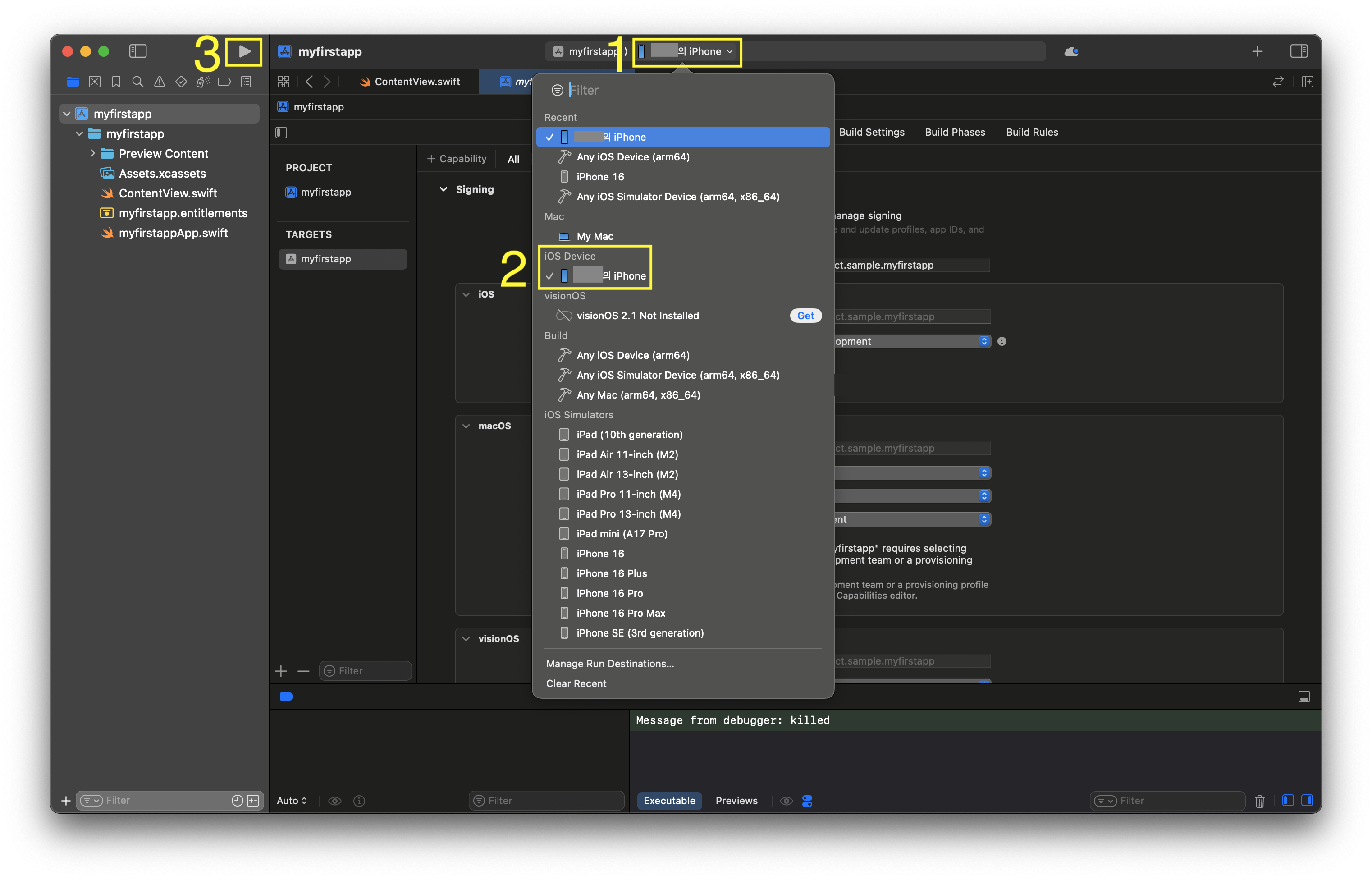 개발 기기로 등록한 아이폰을 맥에 케이블로 연결한 후, Xcode 상단 Run Destination에서 그 기기를 선택해주세요. 그리고 좌측에 있는 재생버튼을 눌러주면