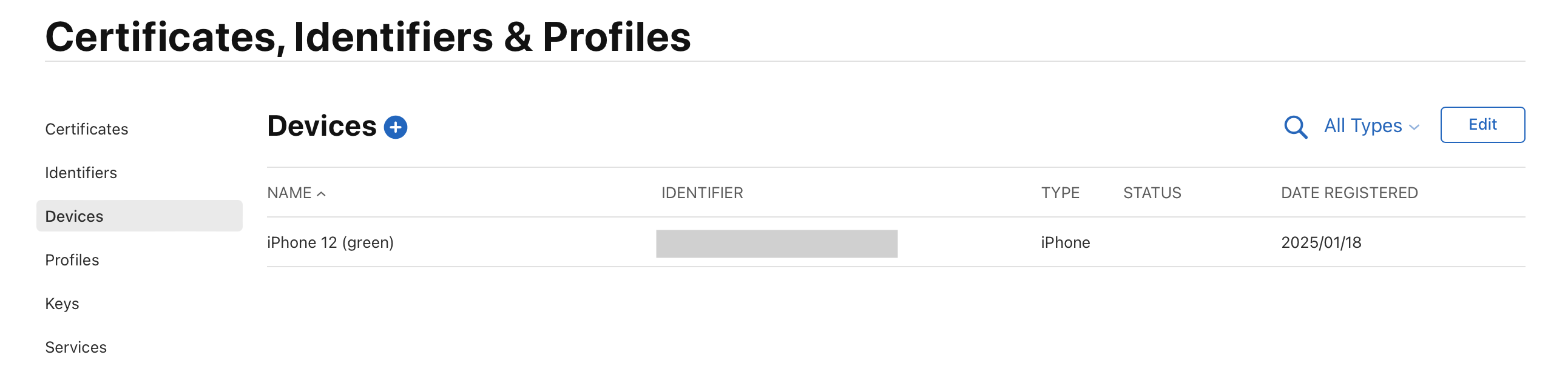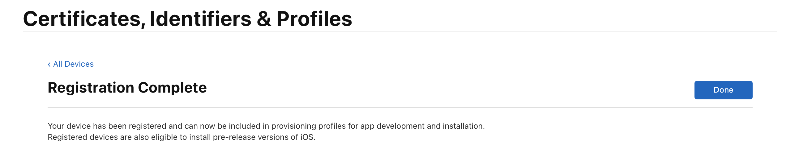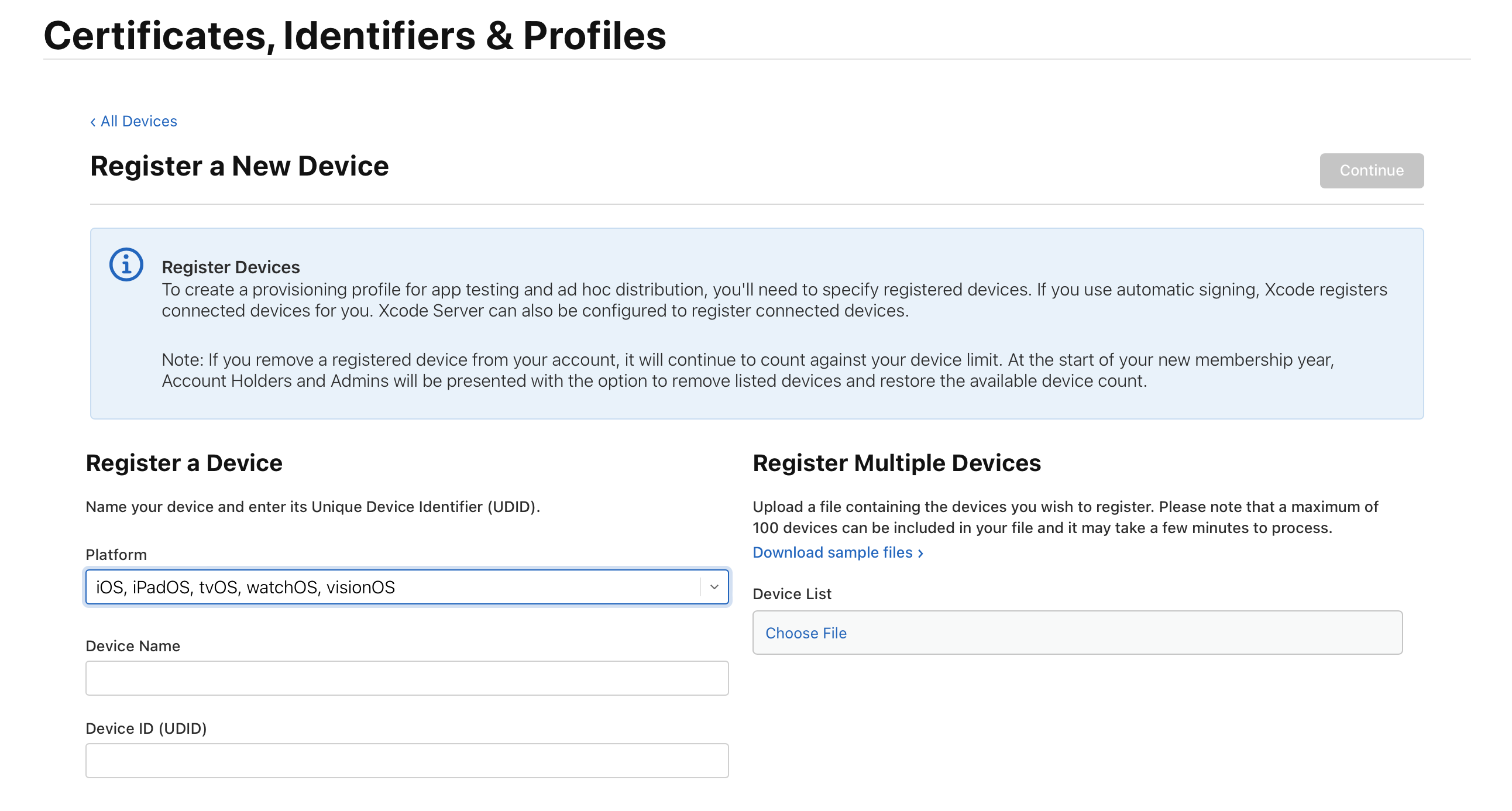 앱을 테스트하거나, 배포하기 위한 프로비저닝 파일을 만들려면 등록된 기기를 명시해야 합니다. 만약에 Xcode에서 automatic signing을 체크해놨다면 이 페이지가 아니라 Xcode에서도 등록할 수 있습니다. 만약에 당신의 개발자 계정에서 등록된 기기를 삭제하더라도, 기기 개수 제한에 여전히 포함 됩니다. 개발자 계정을 갱신할 때, 기기 등록을 진짜 제거하고, 기기 갯수를 복구할 수 있습니다.