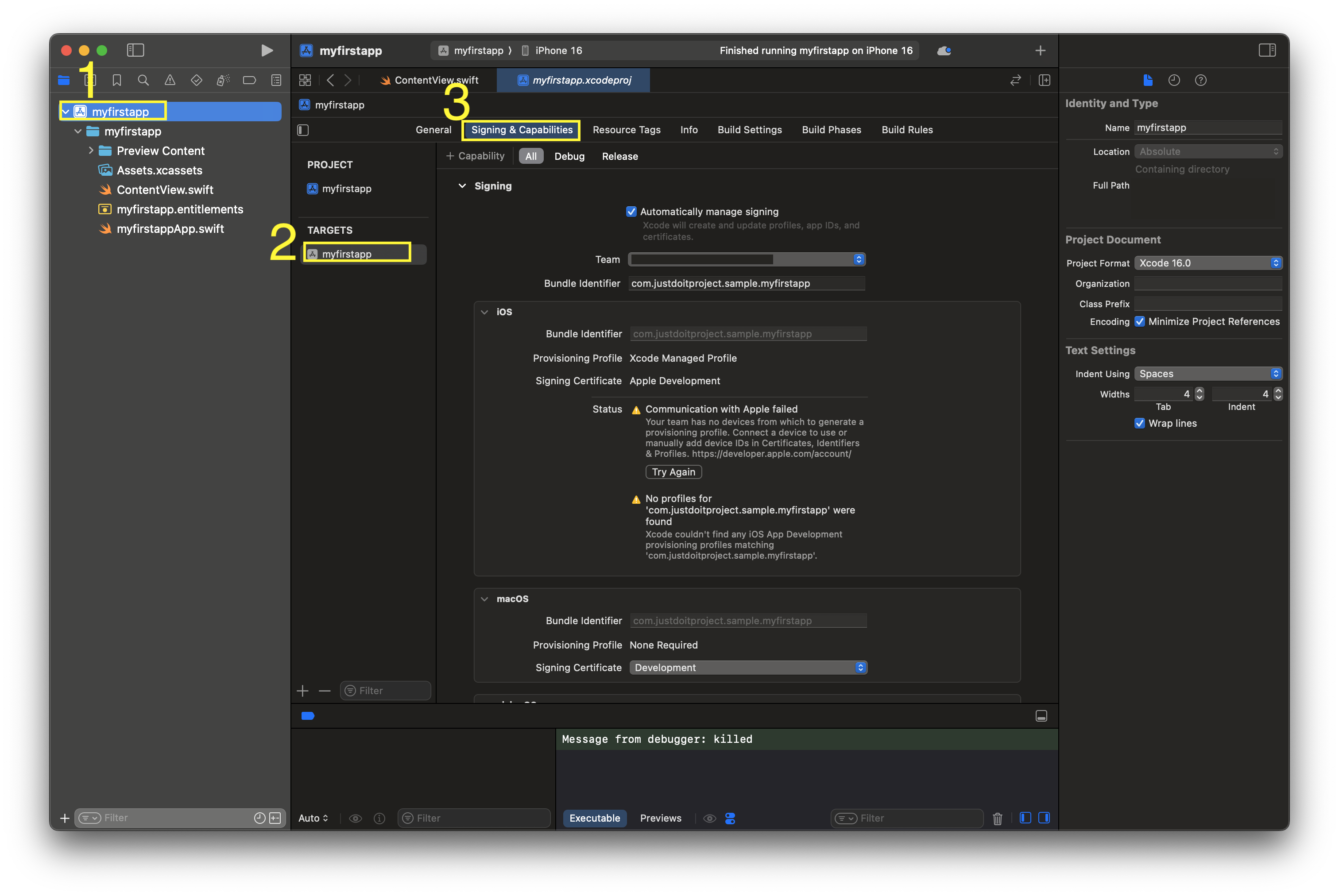그러면 자동으로 Team, Signing Certificate이 채워지면서 모든 오류가 사라진 것을 볼수 있을겁니다. 이제 상단에 Run Destination을 무엇으로 변경해도 오류가 없을겁니다. 이제 진짜 개발을 시작할 수 있게 되었어요. 실물 기기에 앱을 돌려볼까요?