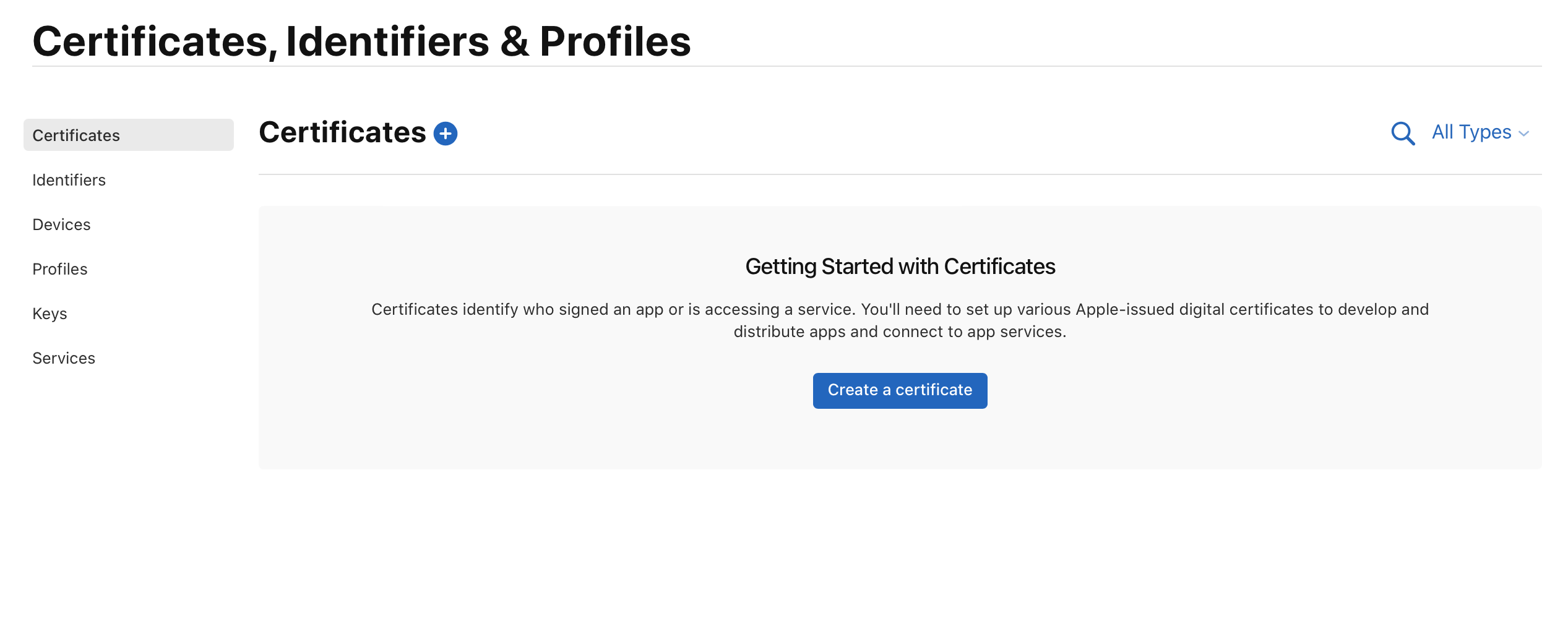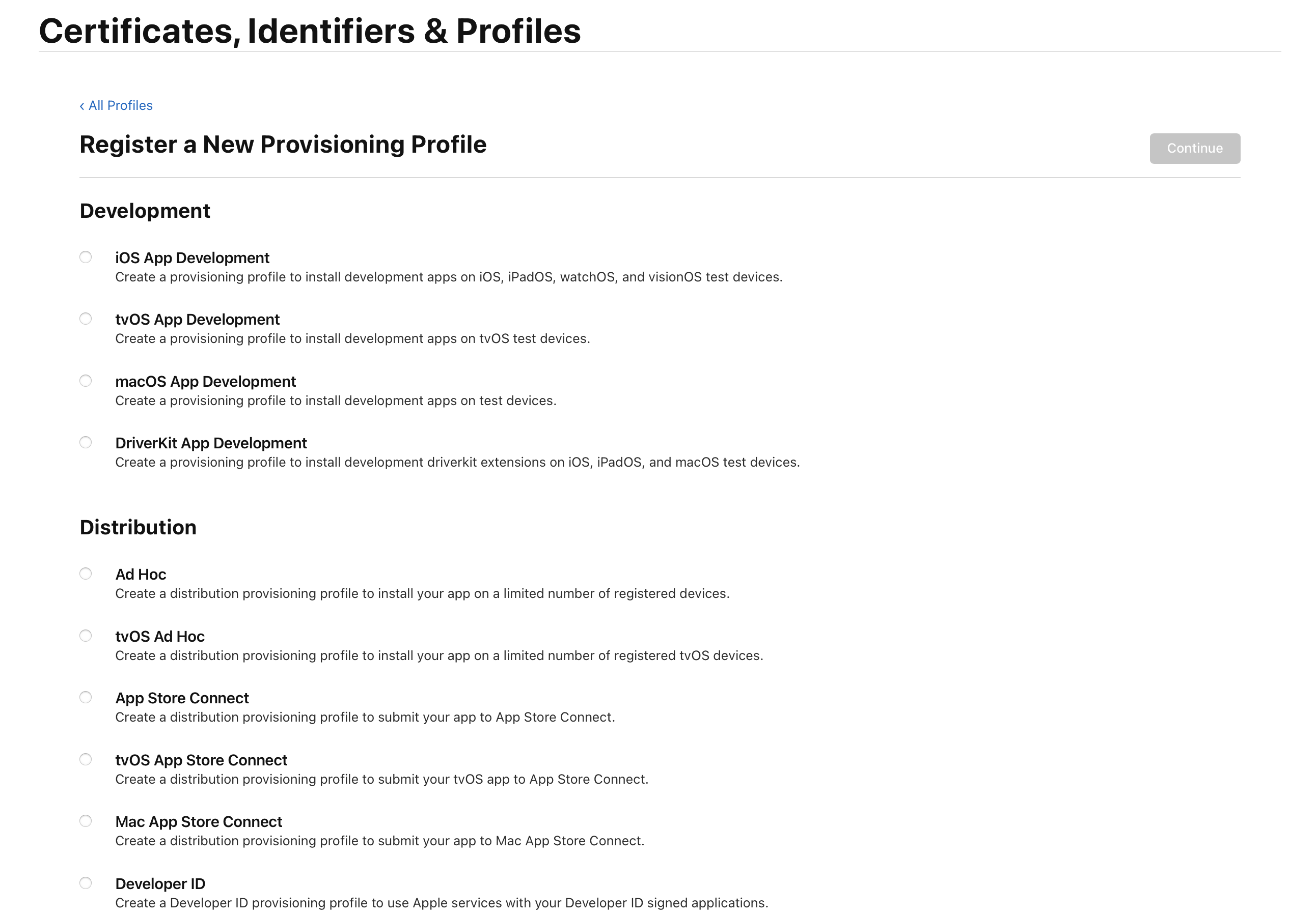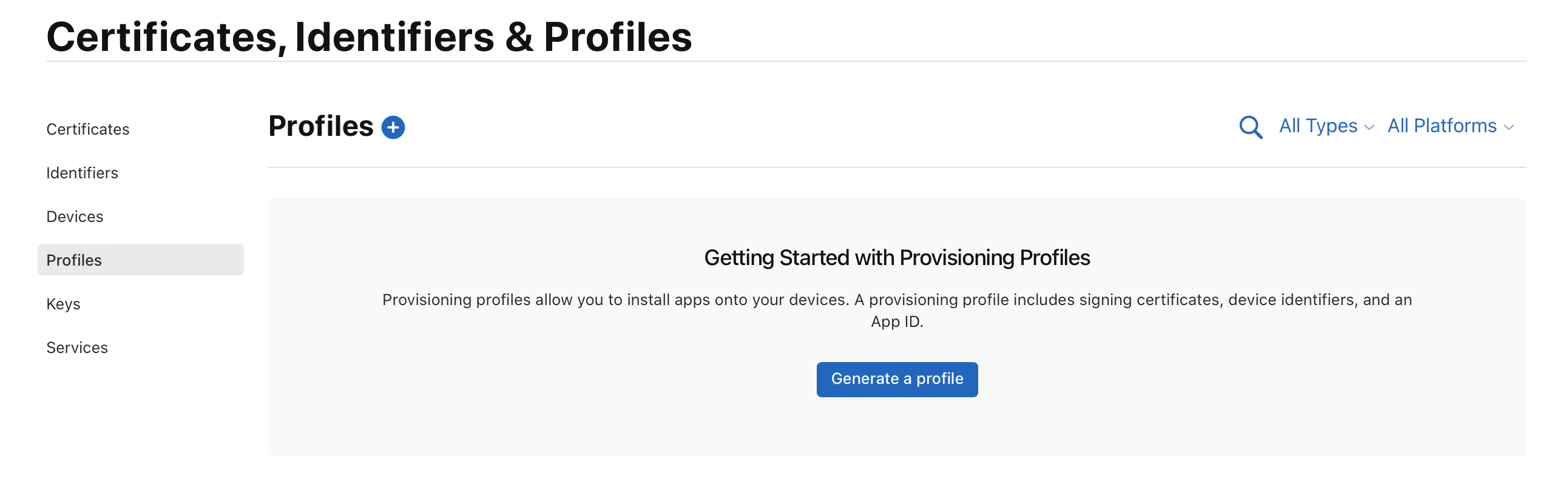 우리는 좌측 메뉴를 순서대로 방문하고 있습니다. Certificates, Identifiers, Devices 이제 Profiles