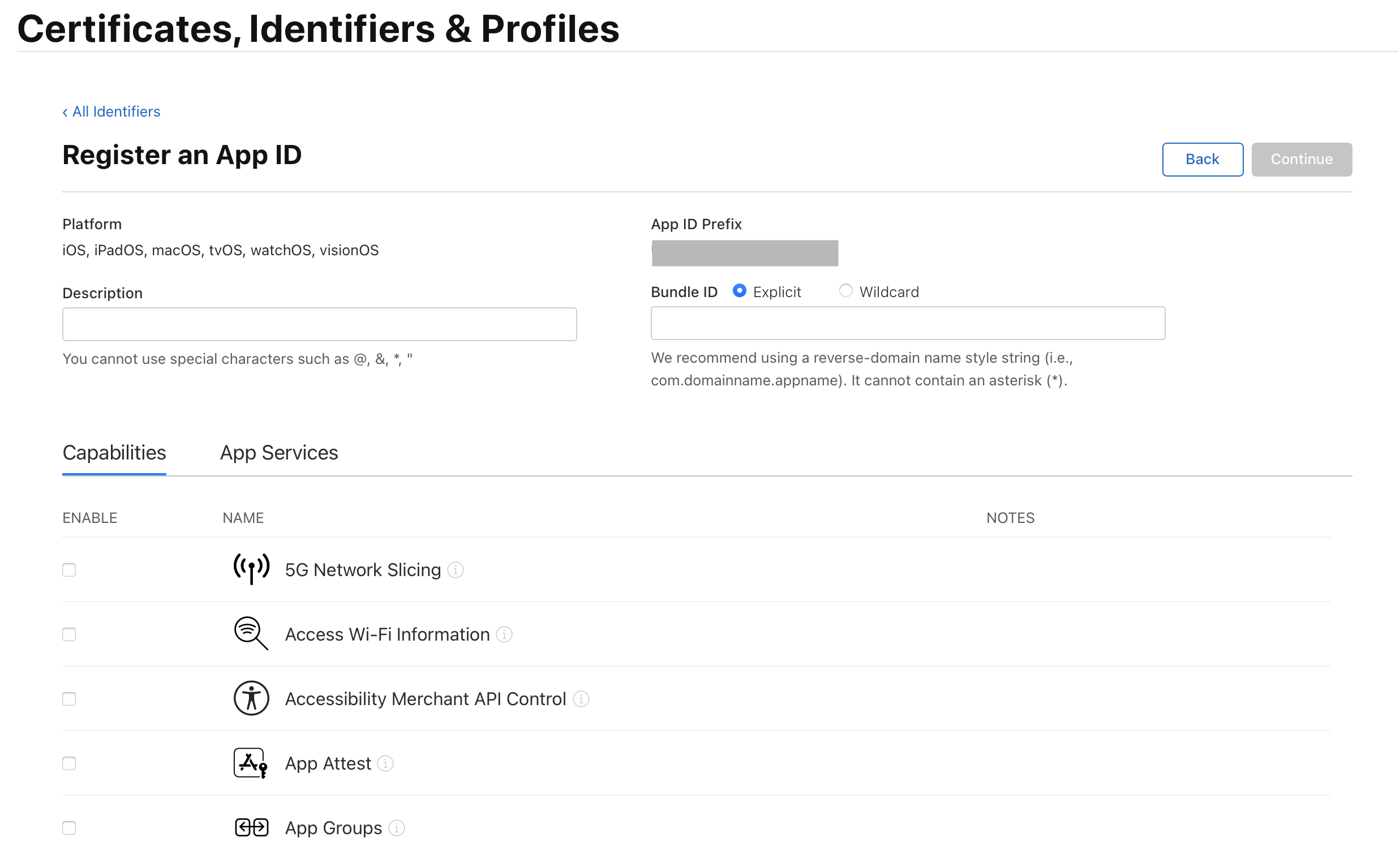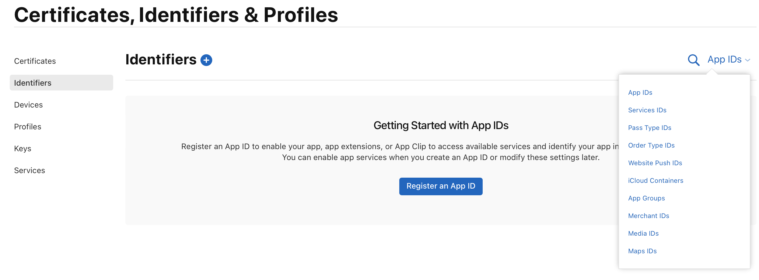 - 개발자 페이지에서 개발할 App ID 등록하기 (Identifier)