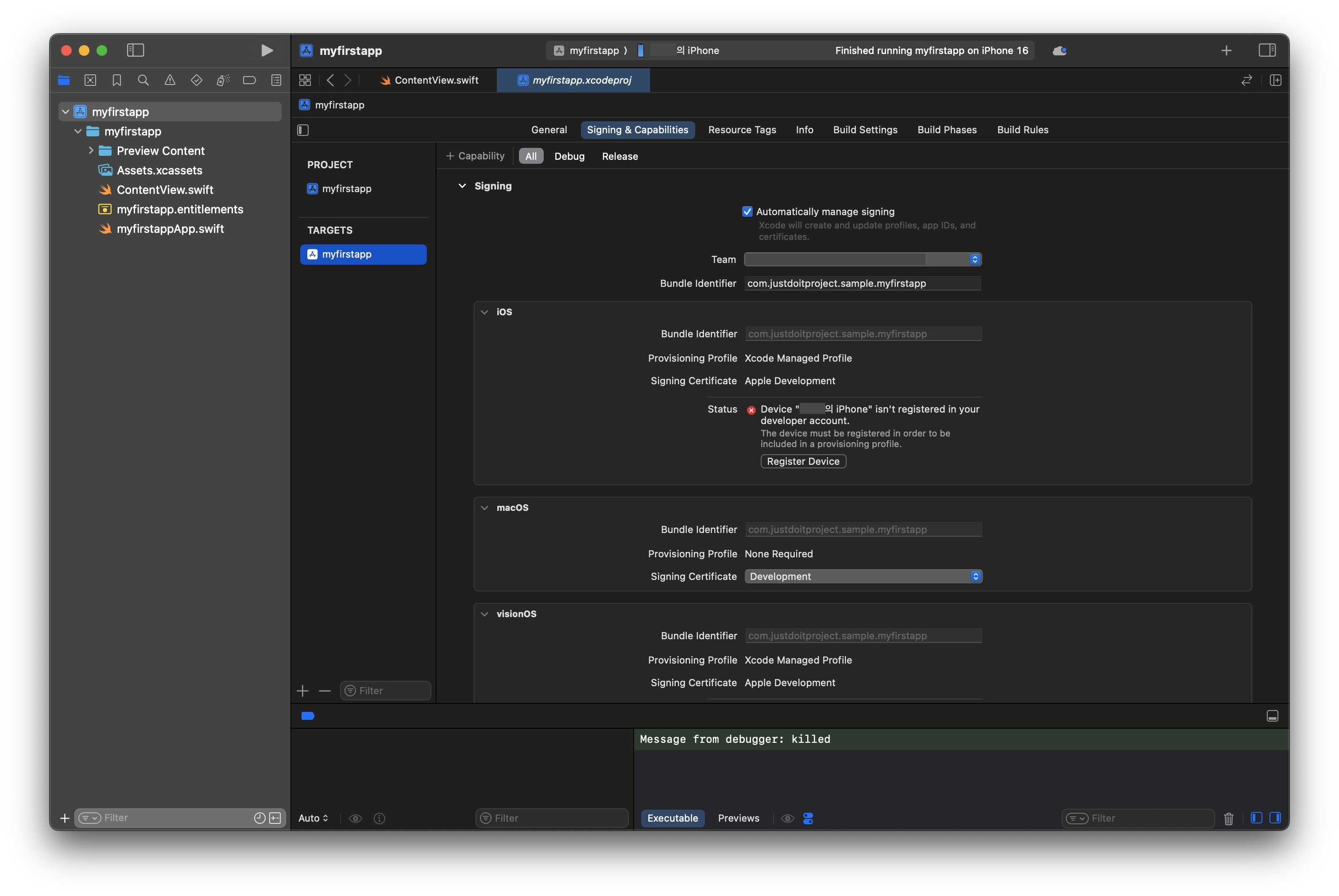 우리는 이 프로젝트의 Bundle ID를 이용해서 App ID를 만들었고, 제 개발자 인증서를 받아서 키체인에 잘 저장 해뒀고, 개발 기기도 등록했으며, Provisioning Profile이라는 관리문서 파일에 App ID, 개발자, 개발 기기를 명시한 뒤, Xcode project에 넣어주었죠. 그래서 비로소 우리는 진짜 개발을 할 준비가 되었습니다.