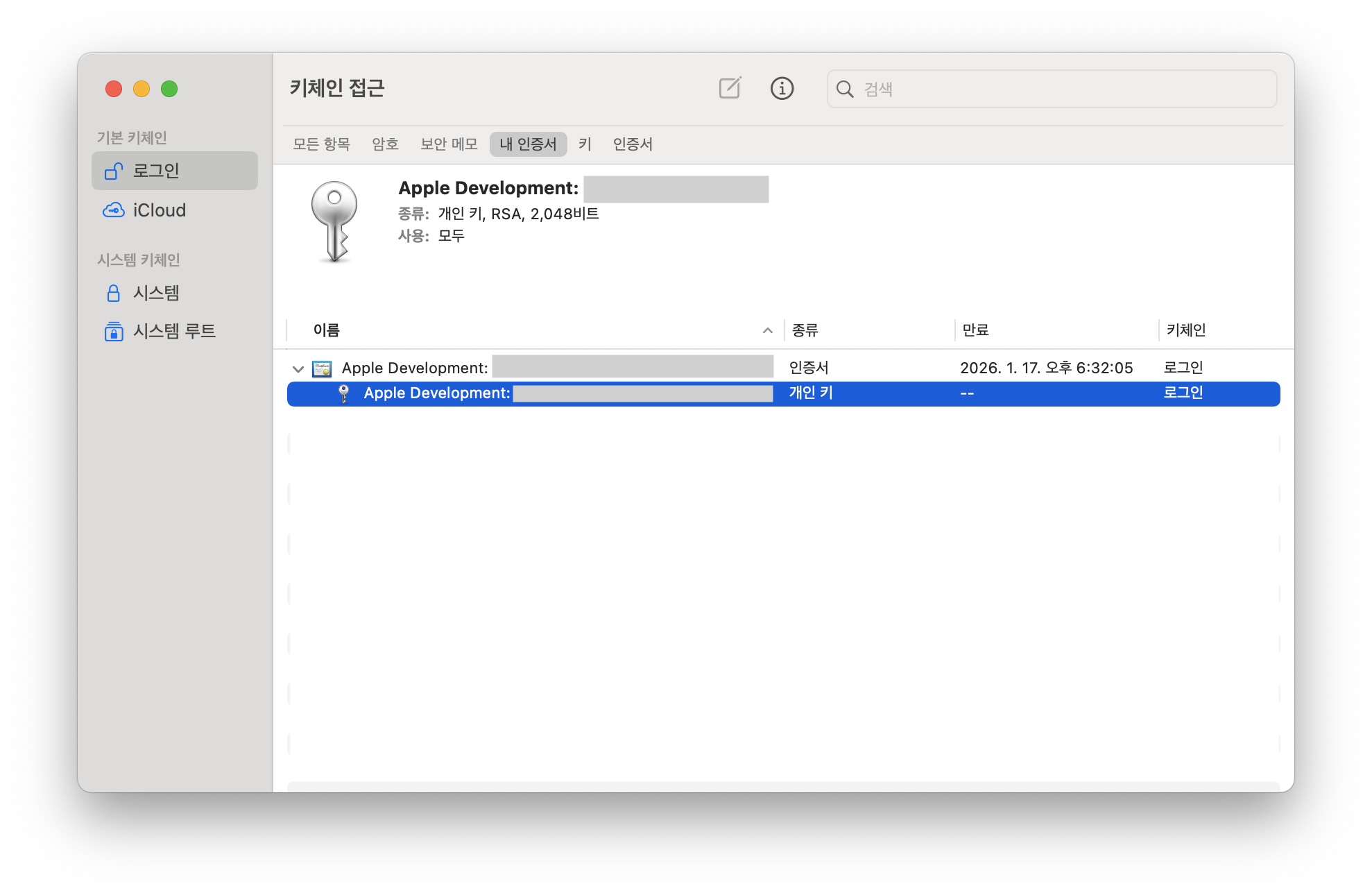 우리는 가장 먼저 개발자 인증서를 받았었죠. 여기서 확인할 수 있습니다.