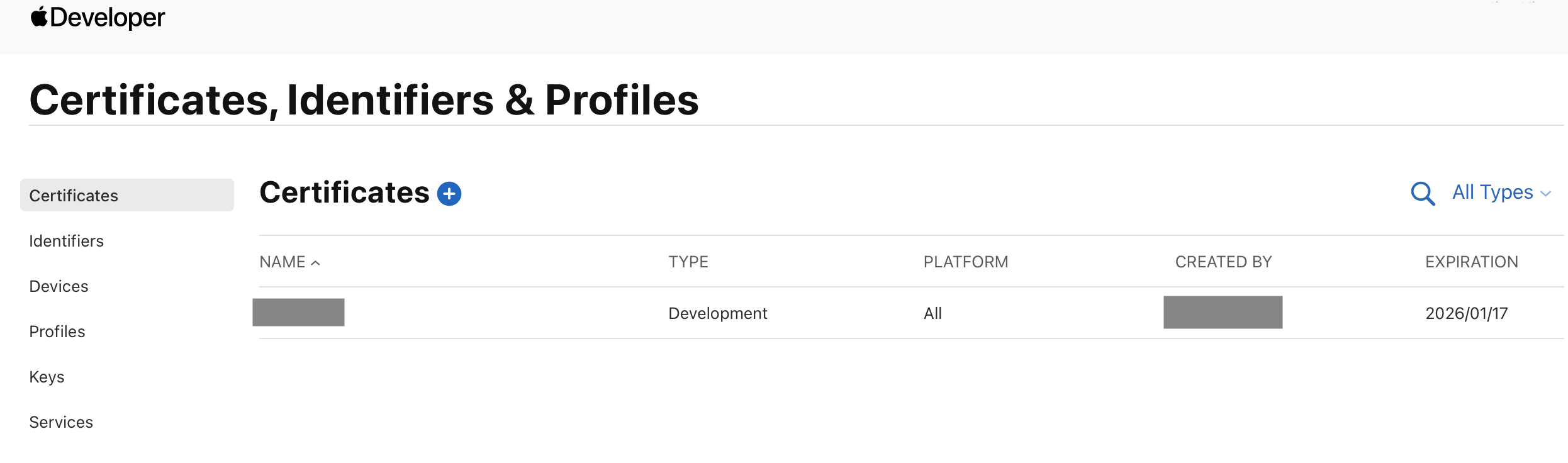 그럼 아래와 같은 창이 뜹니다. 거기서 좌측하단 + 버튼을 눌러 AppleDevelopment를 선택