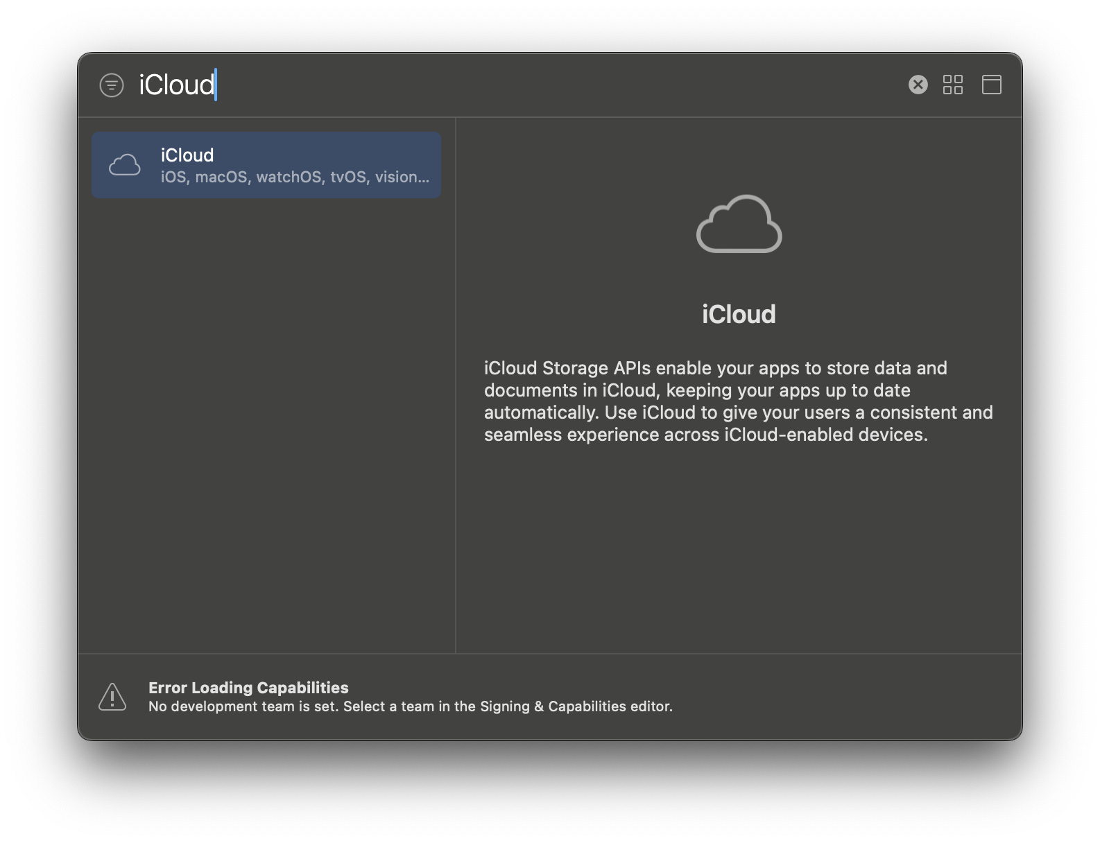 iCloud를 검색하면 아래와 같이 나옵니다. 사용자의 iCloud에 데이터를 저장할 수 있는 기능이죠. 그런데 밑에 에러가 하나 떠있습니다.