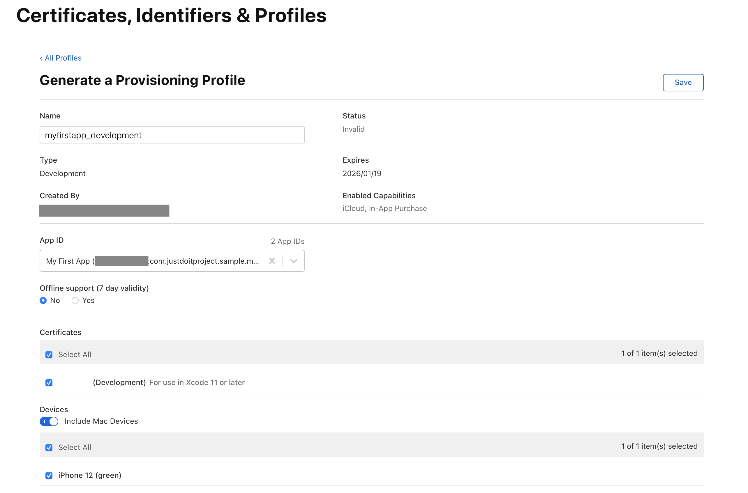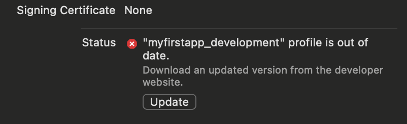 확인을 누르고 Profile로 가보겠습니다. 우리가 생성했던 myfirstapp_development 프로비저닝이 invalid 상태가 된걸 확인할 수 있습니다. App의 Identity가 바뀌었기 때문이죠.