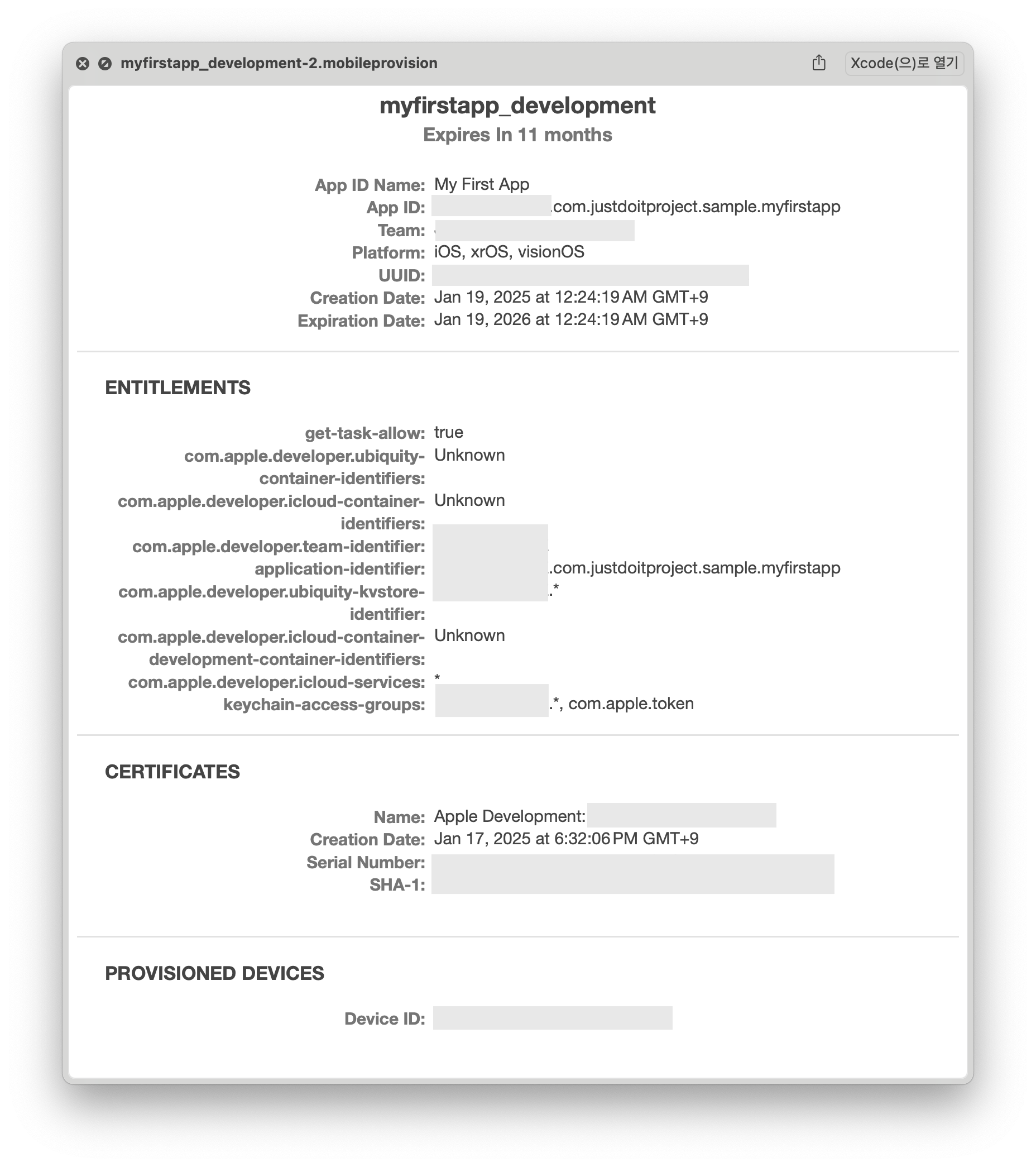 가장 상단에 우리가 지정한 AppID에 대한 내용이 있고, Certificates에 개발자인증서가 하나 포함되어있네요. Provisioned Devices에 허가받은 개발 기기가 하나 추가되어있구요. 두번째 섹션에 Entitlements 라는 단어가 보입니다. Xcode 오류에서 나온 entitlement가 바로 이 친구죠. com.apple.developer.icloud-container-identifiers 라는 항목을 가지고 있나요? Unknwon이긴 하지만 항목이 있긴 하네요. 그래서 오류가 사라진거죠. 아까는 이 항목이 목록에 없었을겁니다.
