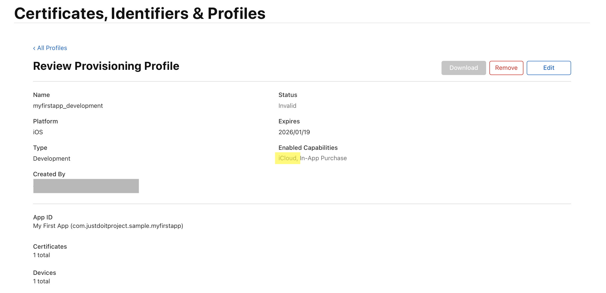 Provisioning profile "myfirstapp_development" doesn't support iCloud capability