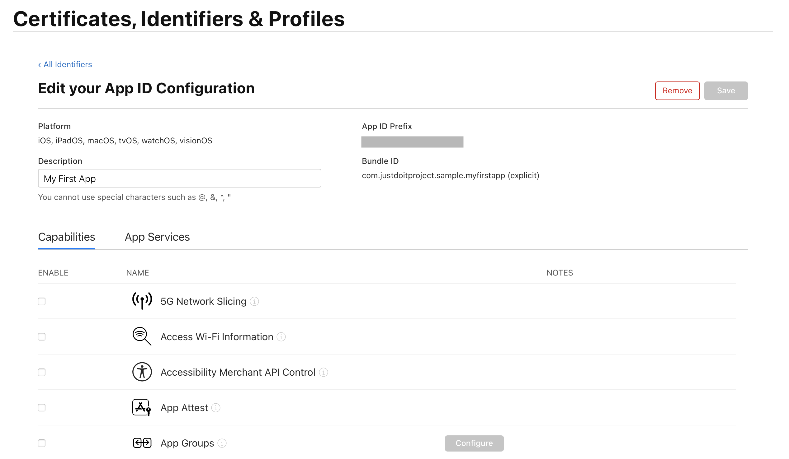 App ID를 만들 때, 번들 ID 아래 Capabilities와 App Services가 있었던 것도 기억하시나요?