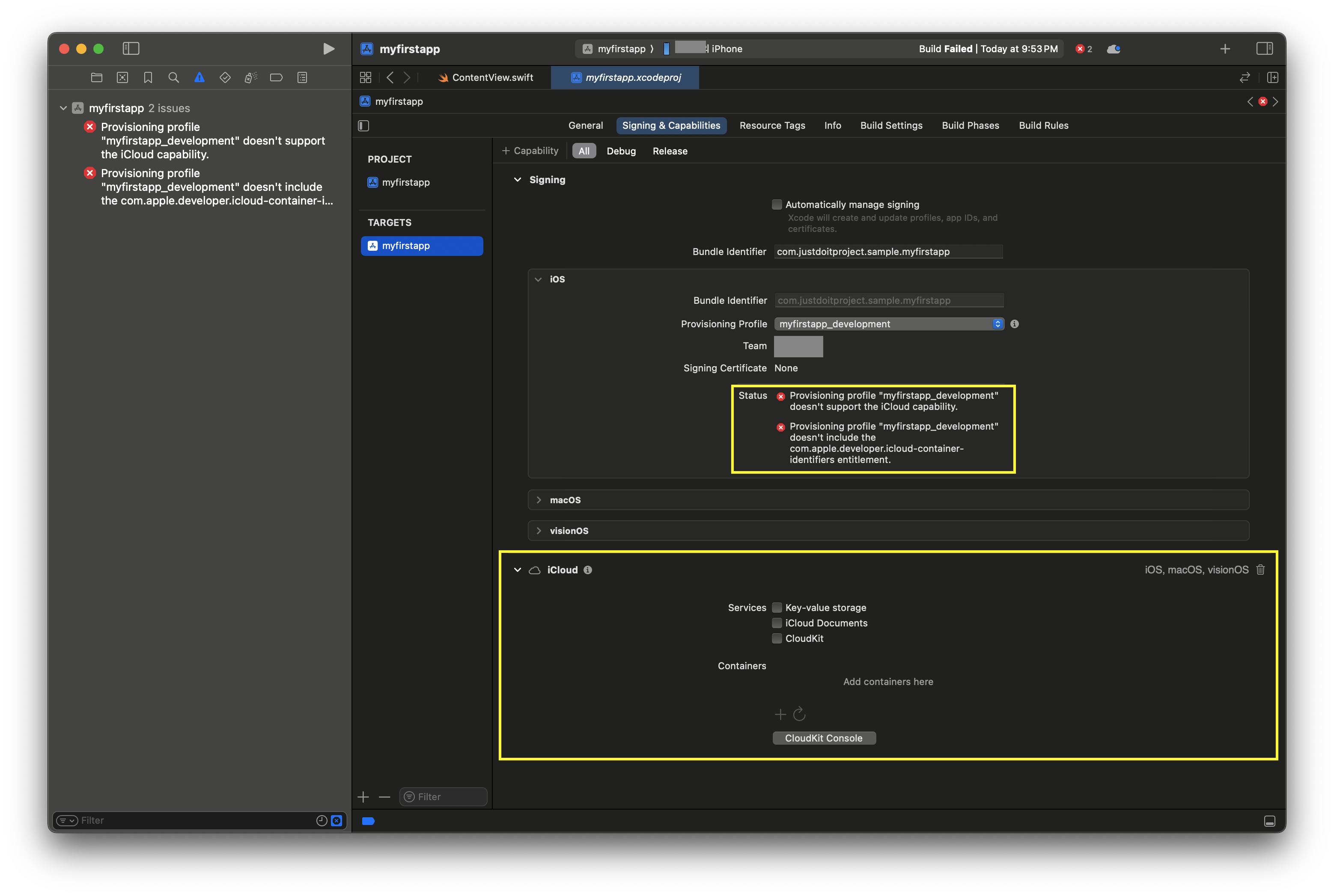 Provisioning profile "myfirstapp_development" doesn't include the com.apple.developer.icloud-container-identifiers entitlement