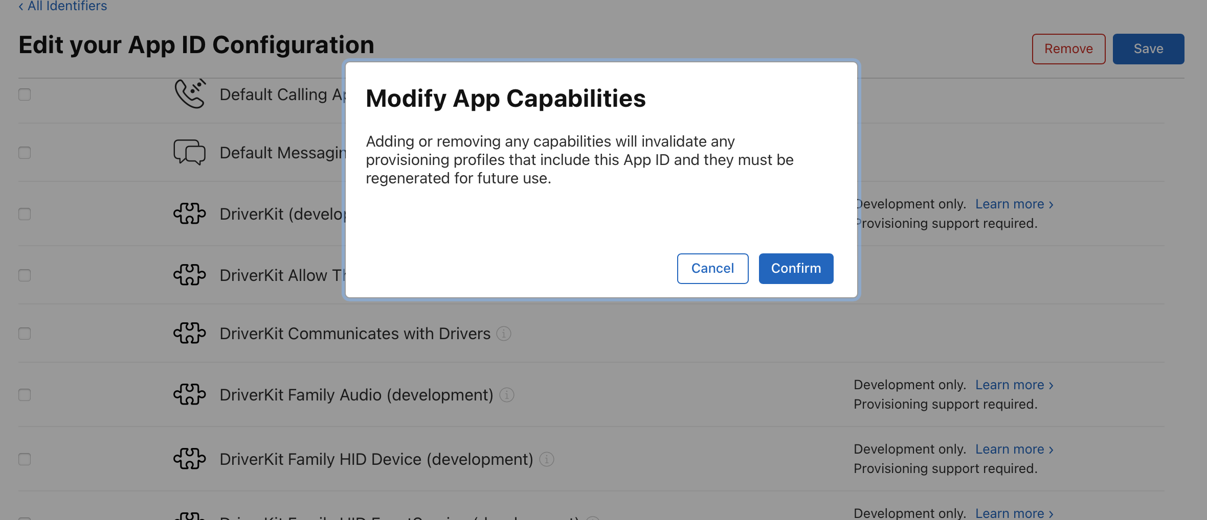 capabilities를 추가하거나, 제거하면 이 AppID로 만든 예전 Provisioning profile은 더이상 유효하지 않아. 다시 만들어서 쓰렴