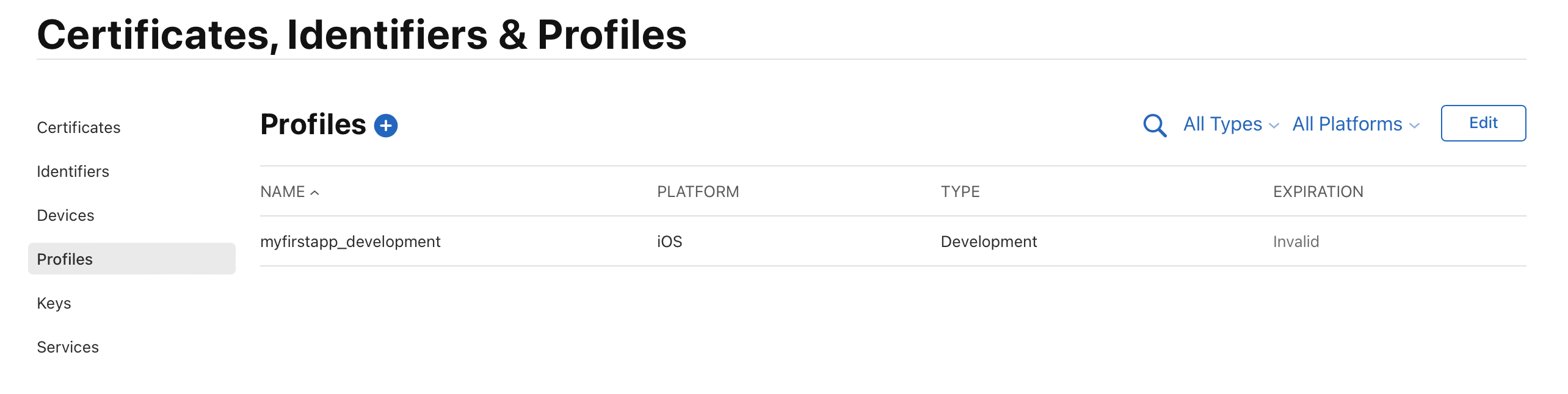 확인을 누르고 Profile로 가보겠습니다. 우리가 생성했던 myfirstapp_development 프로비저닝이 invalid 상태가 된걸 확인할 수 있습니다. App의 Identity가 바뀌었기 때문이죠.